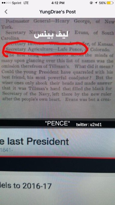 فعلاً ترامب بعد ما فاز بالرئاسة أمر بأمور حادة وهذا نفس المذكور بقصة الكتاب، والكتاب من قبل 124سنة وهذا الرئيس شكل مجلس الوزراء وكان من ضمنهم واحد اسمه Lafe Pence وبالواقع نائب الرئيس الحالي اسمه Mike Pence .. يعني كلهم يحملون اسم بينس بالنهاية.