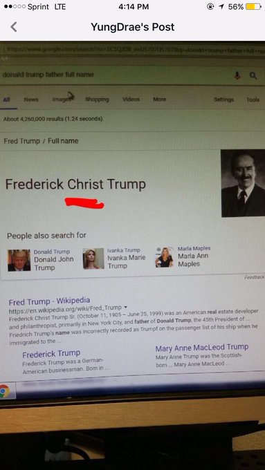 اسم أم ترامب هو (ماري) واسم أبوه هو (كريست) .. في الدين المسيح وعند الأجانب معنى اسم ماري هو (مريم) ومعنى اسم كريست هو (المسيح).