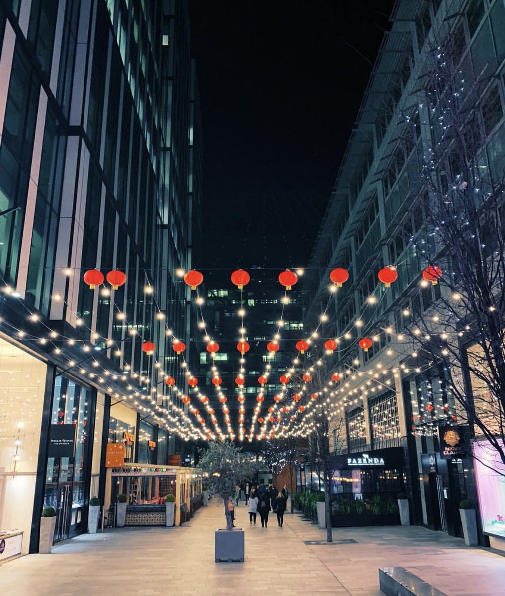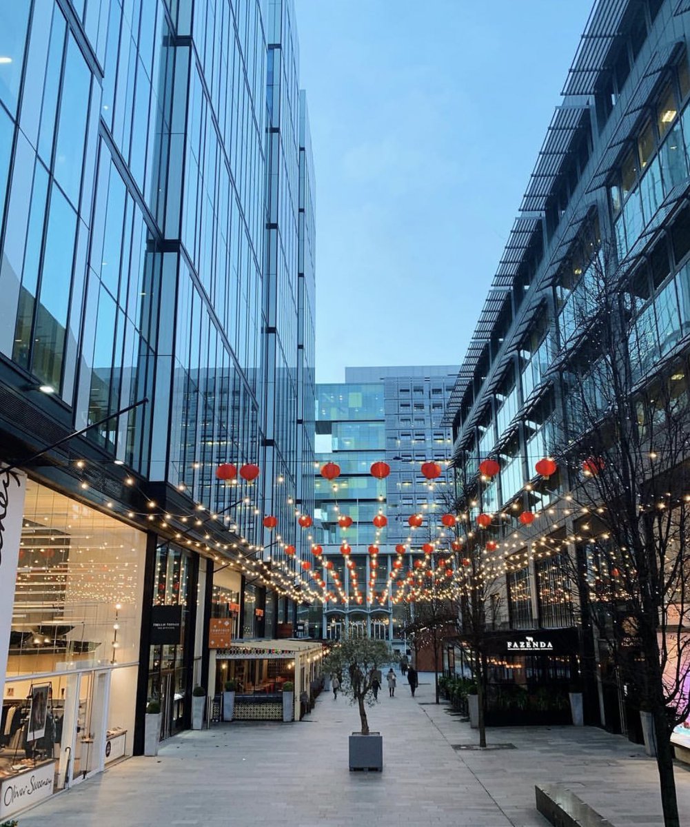 مجمع حديث في وسط #مانشيستر يحتوي على مطعم لبناني ومطاعم اخرى ومقاهي جميلة ومتجر ارماني الشهير .