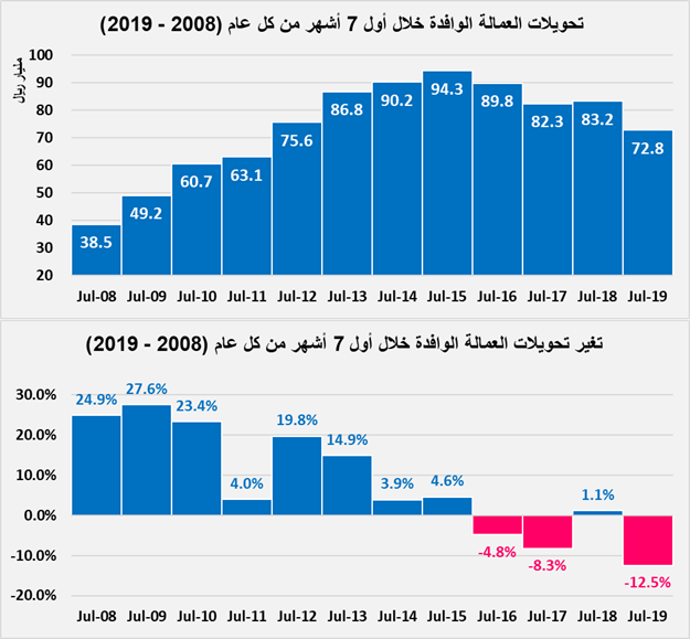 في الوقت الذي انخفضت العمالة الوافدة ذات الأجر المتدني بنسبة -24.8% من نهاية 2016 إلى منتصف 2019 لم يتجاوز انخفاض ذوي الأجور العالية منهم لنفس الفترة سقف -0.8%، وخلال نفس هذه الفترة وصل نمو العمالة الوطنية إلى -0.3% الذي انعكس على معدل البطالة بين المواطنين بالارتفاع!!
