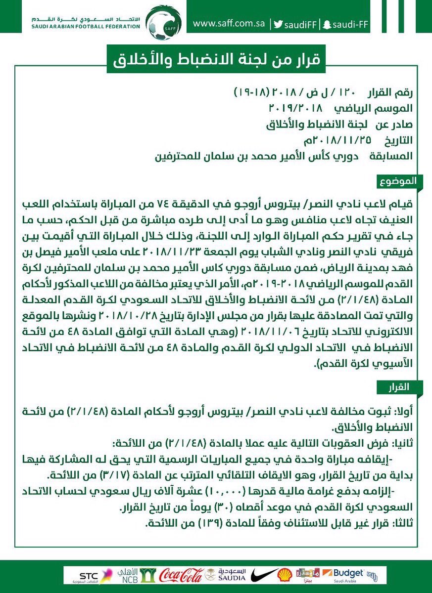 5 - إيقاف لاعب نادي #النصر بيتروس ماثيوس مباراة رسمية واحدة وإلزامه بدفع غرامة مالية قدرها [ 10,000 ] ريال .