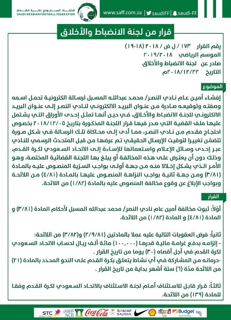 9 - إلزام أمين عام نادي #النصر محمد المسبل بدفع غرامة مالية قدرها [ 100,000 ] ريال ، وحرمانه من المشاركة في أي نشاط يتعلق بكرة القدم لمدة "6" أشهر .
