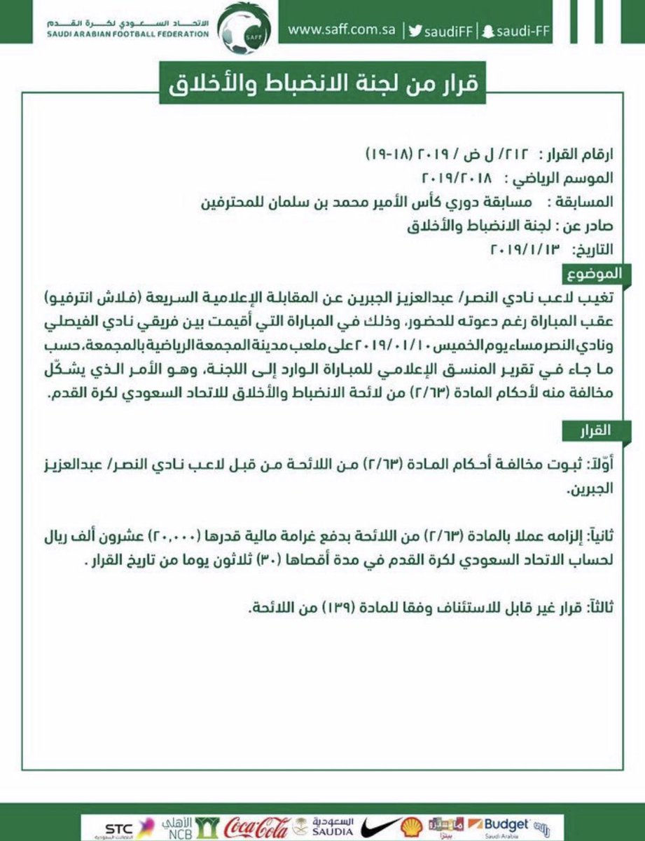 13 - إلزام لاعب نادي #النصر عبدالعزيز الجبرين بدفع غرامة مالية قدرها [ 20,000 ] ريال .