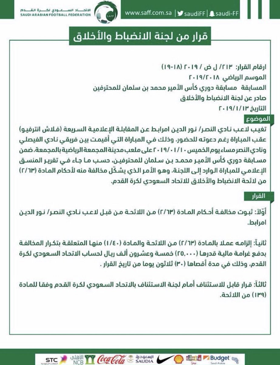 14 - إلزام لاعب نادي #النصر نور الدين امرابط بدفع غرامة مالية قدرها [ 25,000 ] ريال .