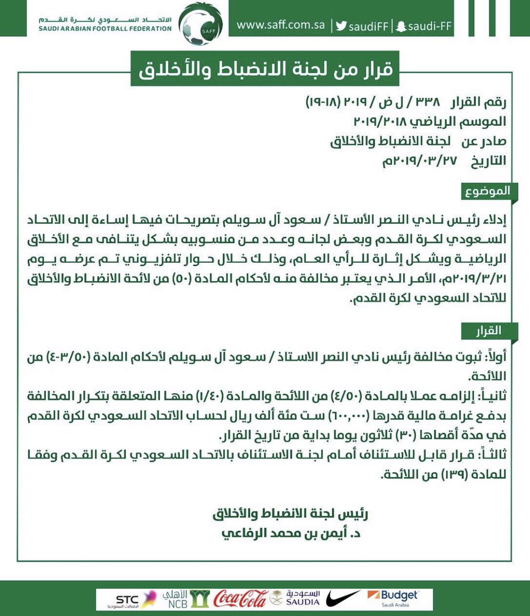 21 - إيقاف رئيس نادي #النصر سعود آل سويلم مباراتين ، وإلزامه بدفع غرامة مالية قدرها [ 1,000,000 ] ريال ، وتمديد مدة الإيقاف إلى حين دفع كامل المبلغ .