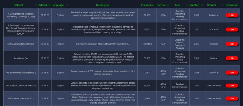 مجهود جبار يجمع مصادر متنوعة من البيانات المجانية عالية الجودة في مجالات متعددة ، تحليل الآراء ، الطب ، معالجة اللغات الطبيعية ، البيئة ، المال ، التعليم، الأمراض المزمنة .. باختصار في كل شيء 👍