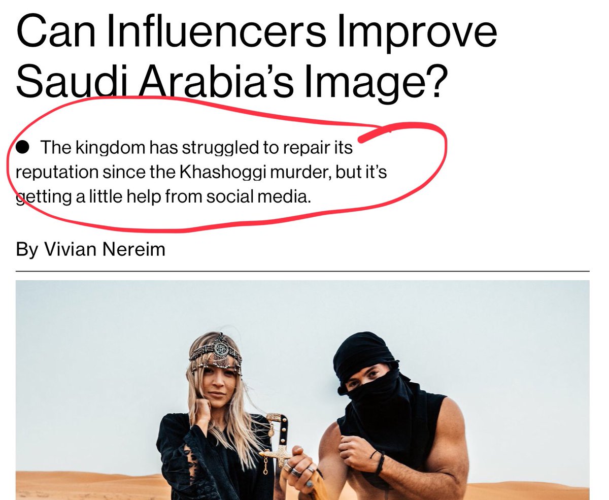 لم يتم الإستشهاد بتصريح من شخص يعمل في مجال التسويق أو هيئة السياحة في السعودية ، وإنما تم إقتباس تصريح من شخص يعمل في منظمة لمراقبة جماعات الضغط وشركات العلاقات العامة في واشنطن.