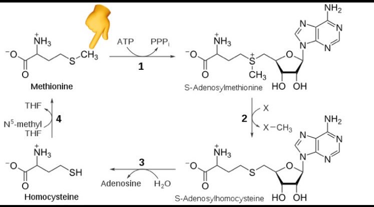 ٤- وجود طفرة (Mutation) في جين (MTHFR)الذي يعطي التعليمات لبناء انزيم يسمى methylenetetrahydrofolate reductase ويلعب دورا رئيسيا في تصنيع الاحماض الامينية بما فيها تصنيع الميثونين من الهوموسيستين