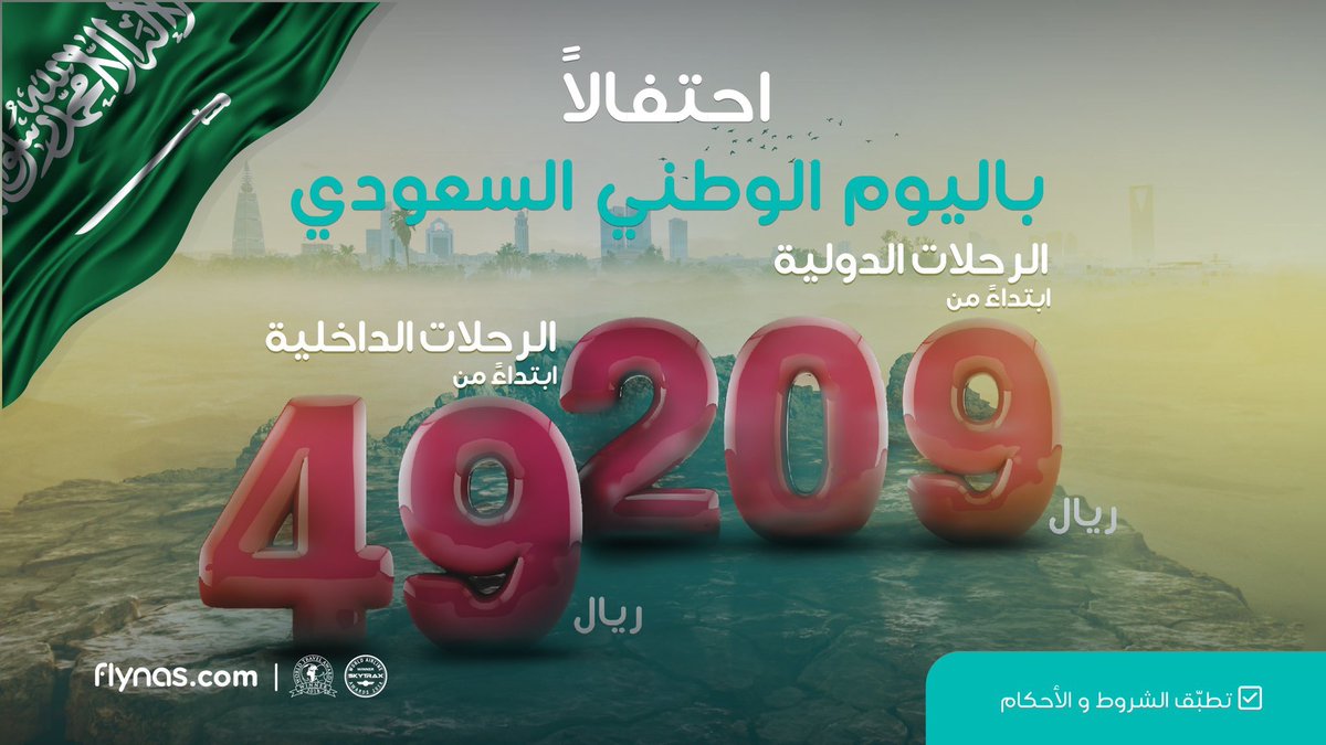 بمناسبة #اليوم_الوطني89 جميع رحلاتنا الداخلية ابتداءً من 49 ريال والدولية ابتداءً من 209 ريال 😍🇸🇦💚