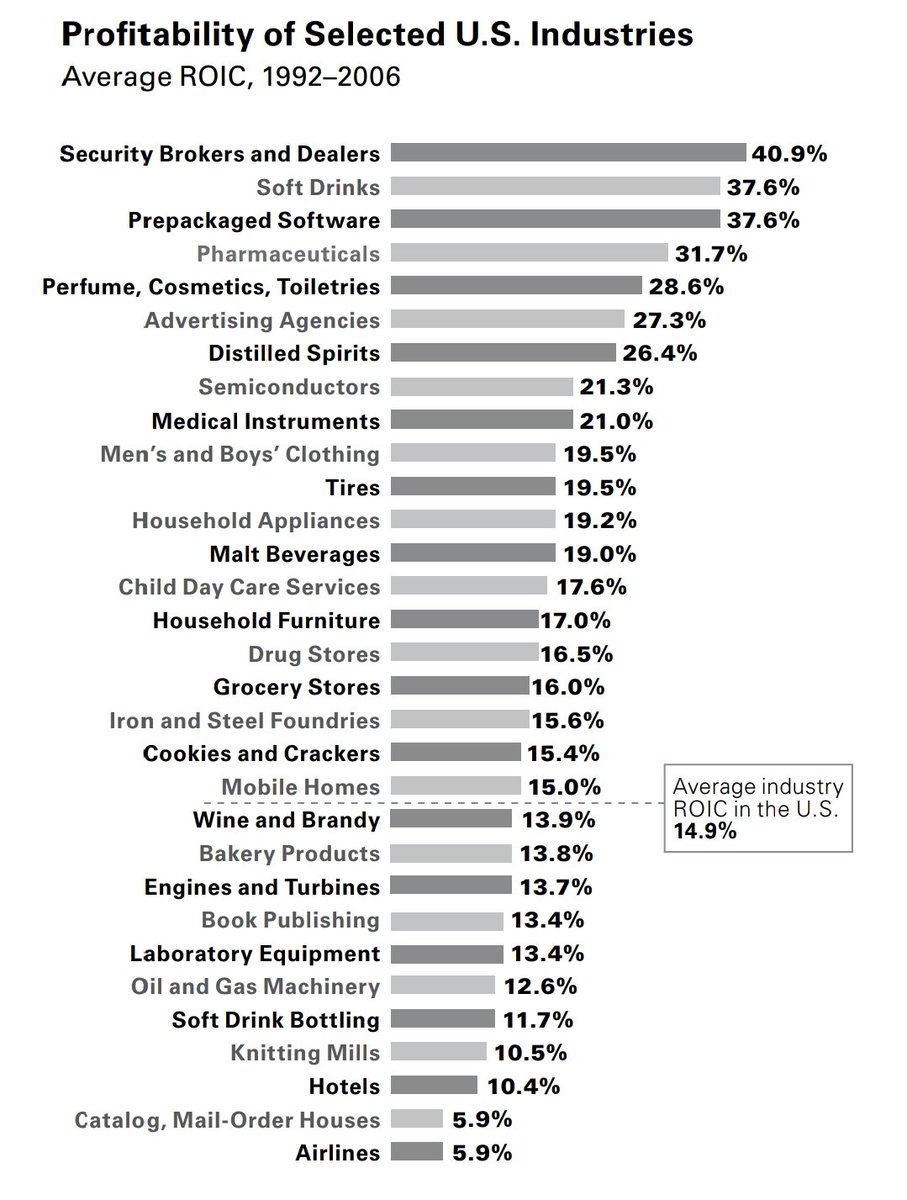 وعليه؛ فكما ترى في الشكل فإن صناعة الطيران في الولايات المتحدة [حيث يحتدم تأثير #القوى_الخمس] هي الأقل من حيث العائد على رأس المال المُستثمر Return on Investment Capital بين العامين 1992-2006 :