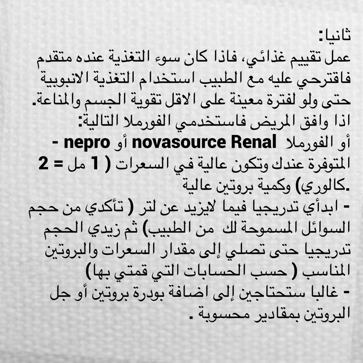 1- عمل تقييم غذائي دقيق للحالة وامداد المريض باحتياجه الكامل من السعرات الحرارية والبروتين
