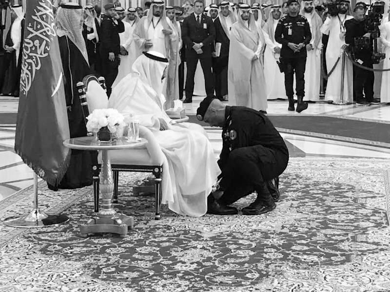 في هذا المقطع حاول أحد الأشخاص وضع يده على كتف الملك أثناء التقاط صورة معه، إلا أن الحارس #عبدالعزيز_الفغم سارع لمنع الشخص. في الحفل الثقافي في مركز الشيخ جابر الأحمد الثقافي، على هامش زيارة العاهل السعودي لدولة الكويت في نهاية عام 2016م.