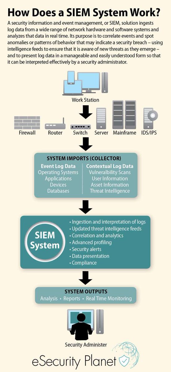 يُعتبر SIEM نظام مركزي ممنهج لإدارة #الامن_السيبراني ويجمع بين وظائف SIM (إدارة معلومات الأمن)و SEM (إدارة الأحداث الأمنية) في نظام واحد يتم فيه تجميع الأحداث والتنبيهات الأمنية من مختلف الأجهزة والأنظمة والتقنيات الموجودة في البنية التحتية الشبكية الخاصة بالمنظمة أو الشركة ٢ / ٨