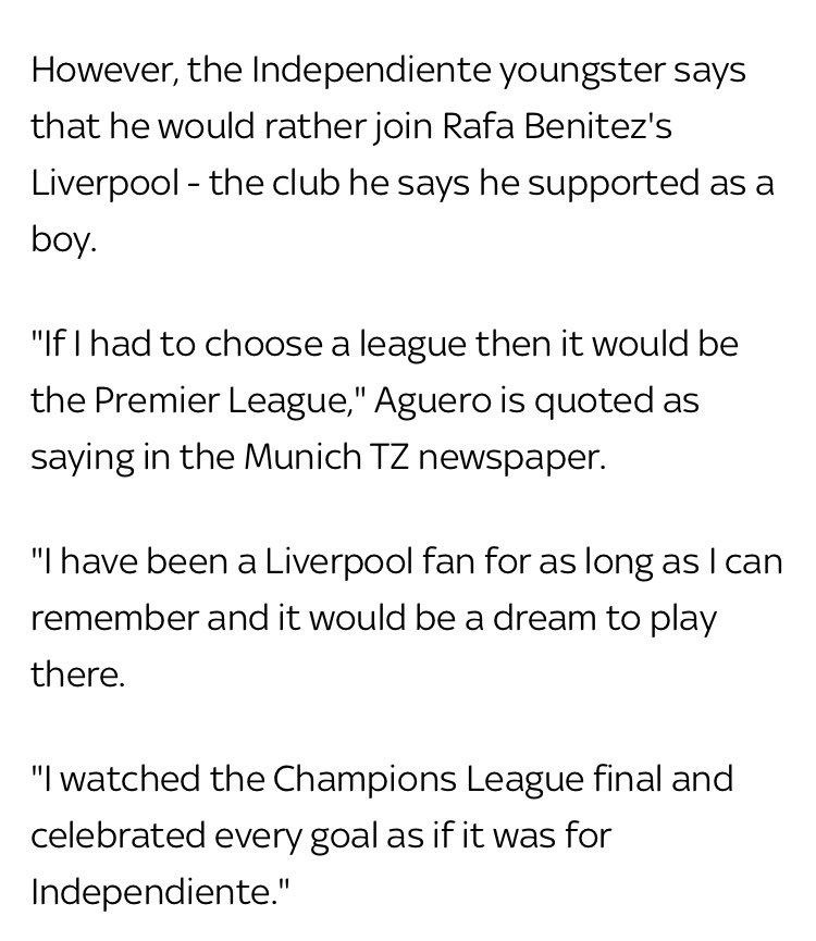 - سيرجيو اغويرو سعى بينتيز جاهداً الى ضمه لنادي ليفربول عام ٢٠٠٦، كذلك صرح اغويرو انه ليفربولي منذ الصغر واحتفل بجنون عند تحقيق ليفربول لدوري الابطال عام ٢٠٠٥ لكن ناديه أراد ما يقارب الـ٢٠ مليون يورو وتم رفض الفكرة من ادارة ليفربول بسبب "المغالاة" في السعر والمخاطرة