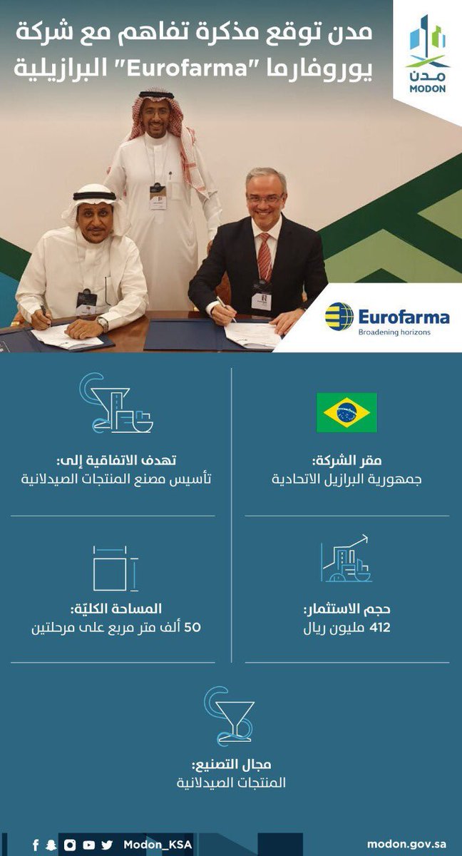 ضمن #مبادرة_مستقبل_الاستثمار وقعت #التجمعات_الصناعية مذكرة تفاهم في مجال الأدوية واللقاحات مع شركة EUROFARMA البرازيلية بقيمة 412.5 مليون ريال