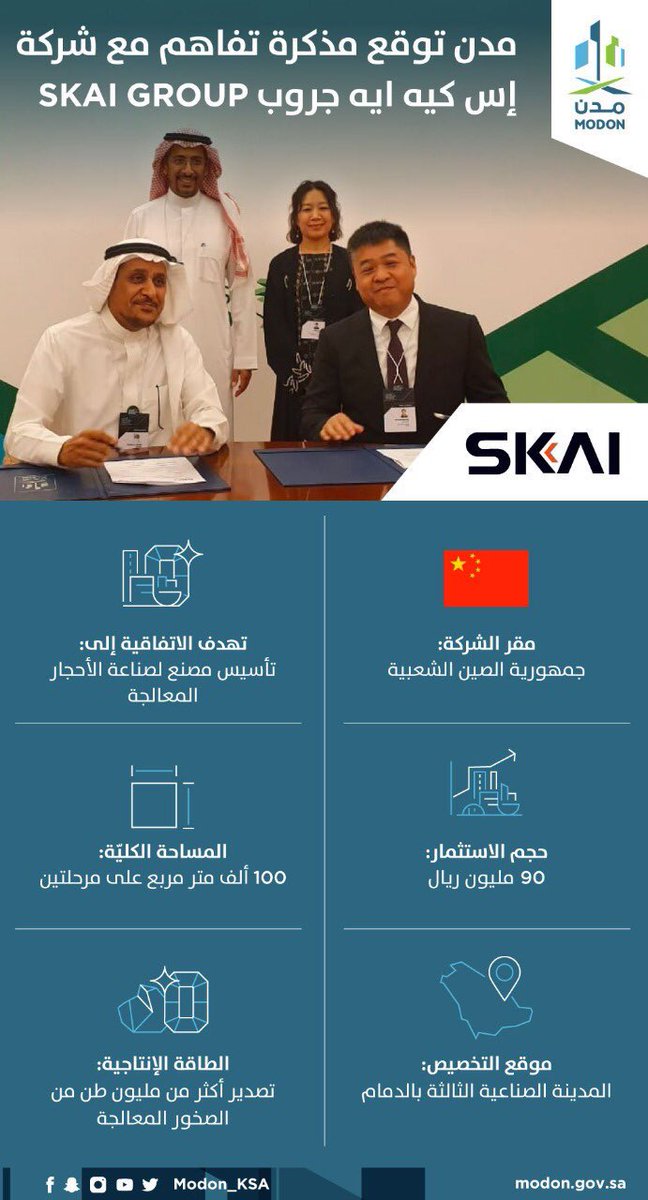 #مدن توقع مذكرتي تفاهم على هامش #مبادرة_مستقبل_الاستثمار، الأولى مع شركة "Eurofarma" البرازيلية للمنتجات الصيدلانية والثانية مع شركة "SKAI GROUP" الصينية لمعالجة الصخور والمعادن النوعية