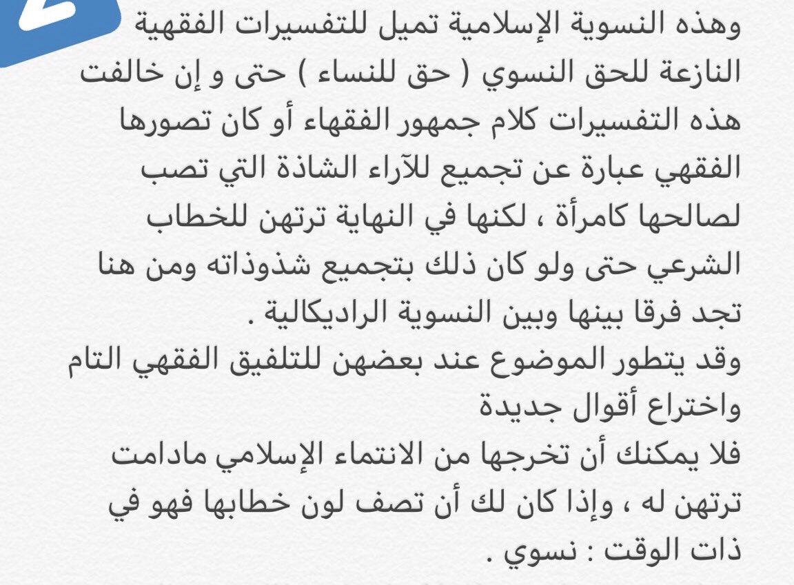#النسوية_الاسلامية فئة تصنف نفسها بـ(طالبات علم وفقيهات) تتبنى وتروّج لفكرة اجتماع الفكر النسوي مع الإسلام في تشريع مطالب النسوية الراديكالية ونزع الصورة الأيدولوجية عنها وتصوير أنها حركة حقوقية.