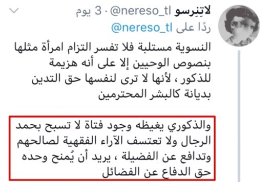 هو حال #النسوية_الاسلامية باستخدام معيار الرجولة وإعادة تعريفه في كل موقف حسب الحاجة، وهنا تستخدمه على سبيل المقارنة الجنسية والتشيين والاحتقار والإحراج كأسلوب نفسي لردع المعترض (الرجل)