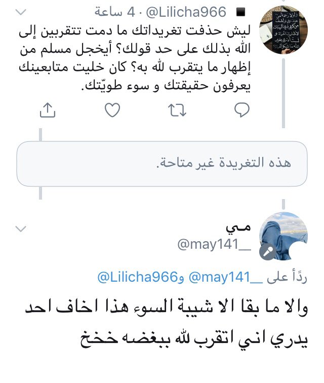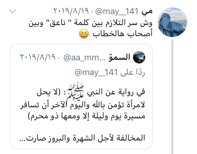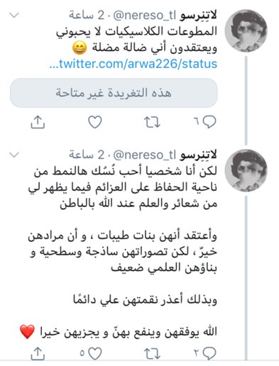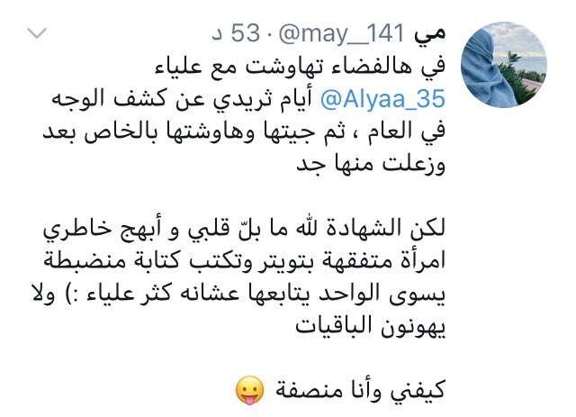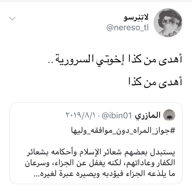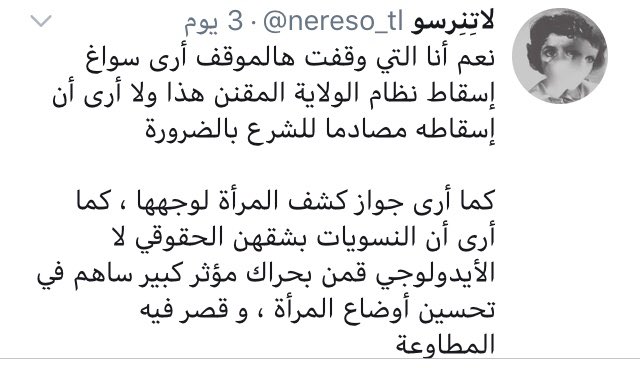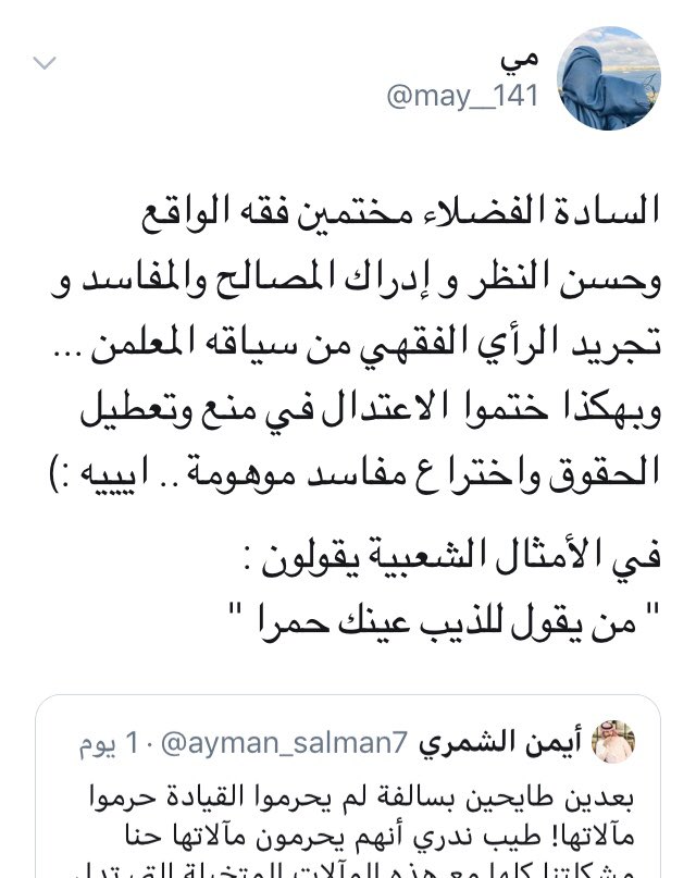 فتقول (لا تلبسونا عباءة المشيخة) و(لا تأخذونا بدور المنبرة) و(نحن نطرح آراء وأفكار وليست تشريعات) فتكون بذلك خرجت من المأزق مؤقتاً وحذفت التغريدات والردود، لتعود مرة أخرى في موضوع آخر وهكذا.