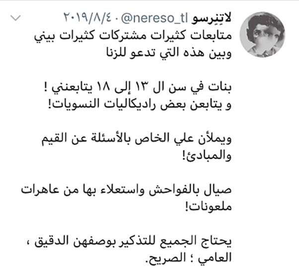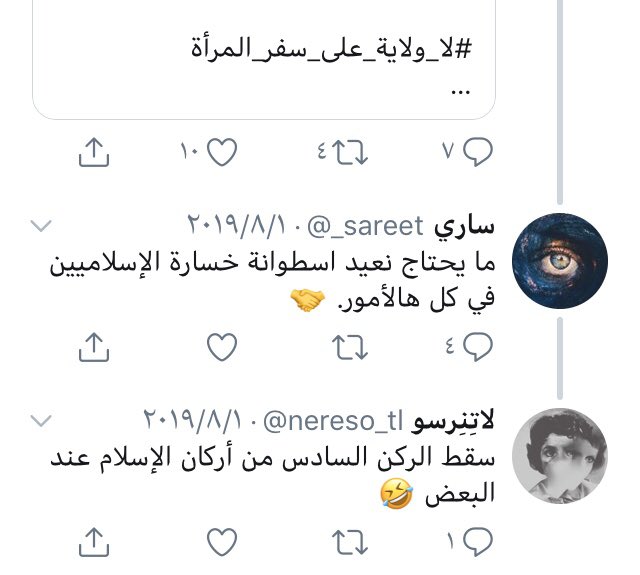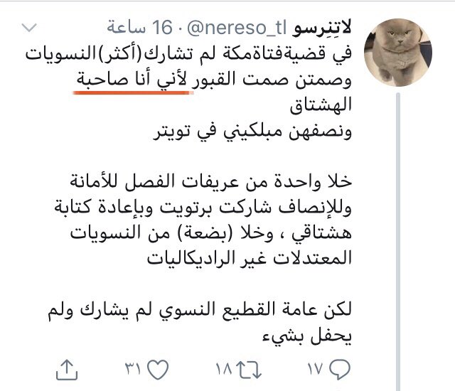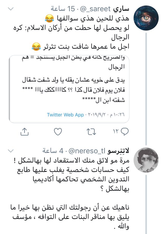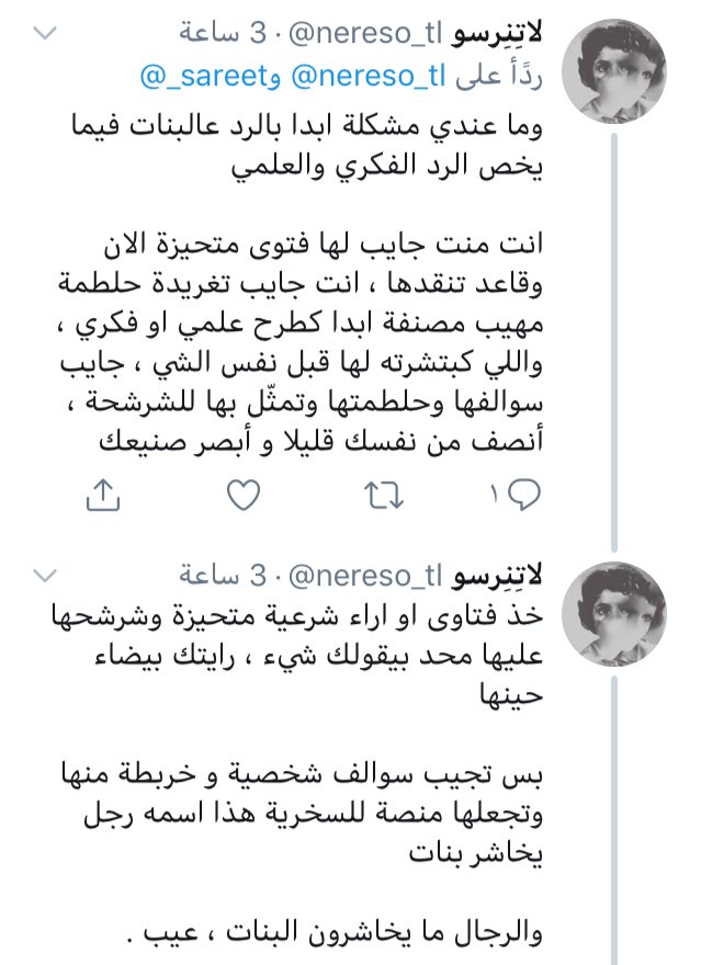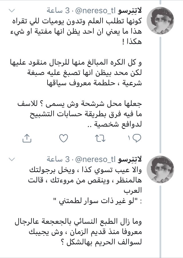وفي كلا الاتجاهين يقوم القطيع المتابع بصمت لطرح #النسوية_الاسلامية بالإضافة إلى المتدثرات من طالبات العلم والمتدينات بالقيام بهذه الأدوار عبر الحسابات الجديدة والأتباع ممن ليس لهم تاريخ إلا الصمت والخروج في الوقت المناسب لحرب الذكوريين والتشويه كاستمرار لمواجهتهم
