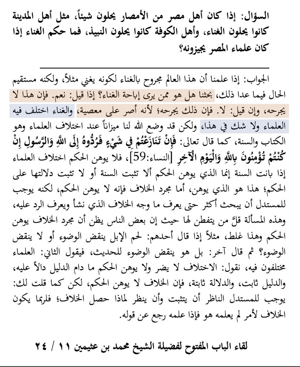 ٢- كلام الشيخ رحمه الله في أن من رأى من العلماء إباحة الغناء فلا يجرحه ذلك ، فالغناء المقصود ليس الغناء الذي نراه الذي اجتمعت فيه عدة محرمات