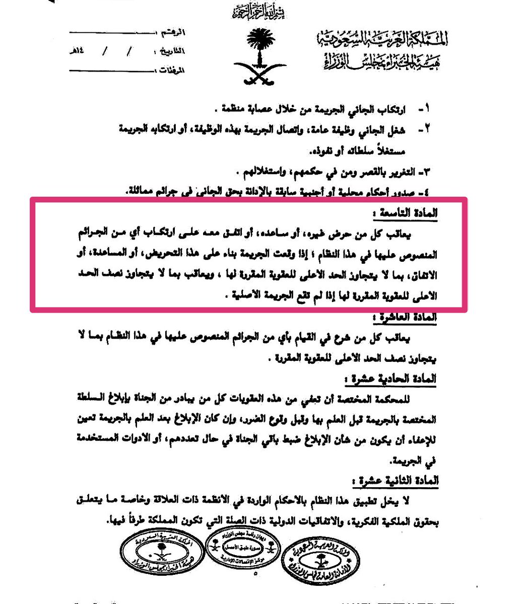 لمخالفة المواد م /9 و 10 و 11 و 12 من النظام الأساسي للحكم .. والمواد م/6-1 و م/9 من نظام مكافحة الجرائم المعلوماتيه.