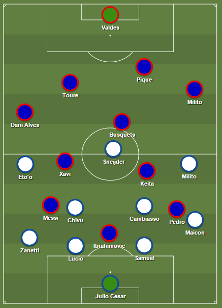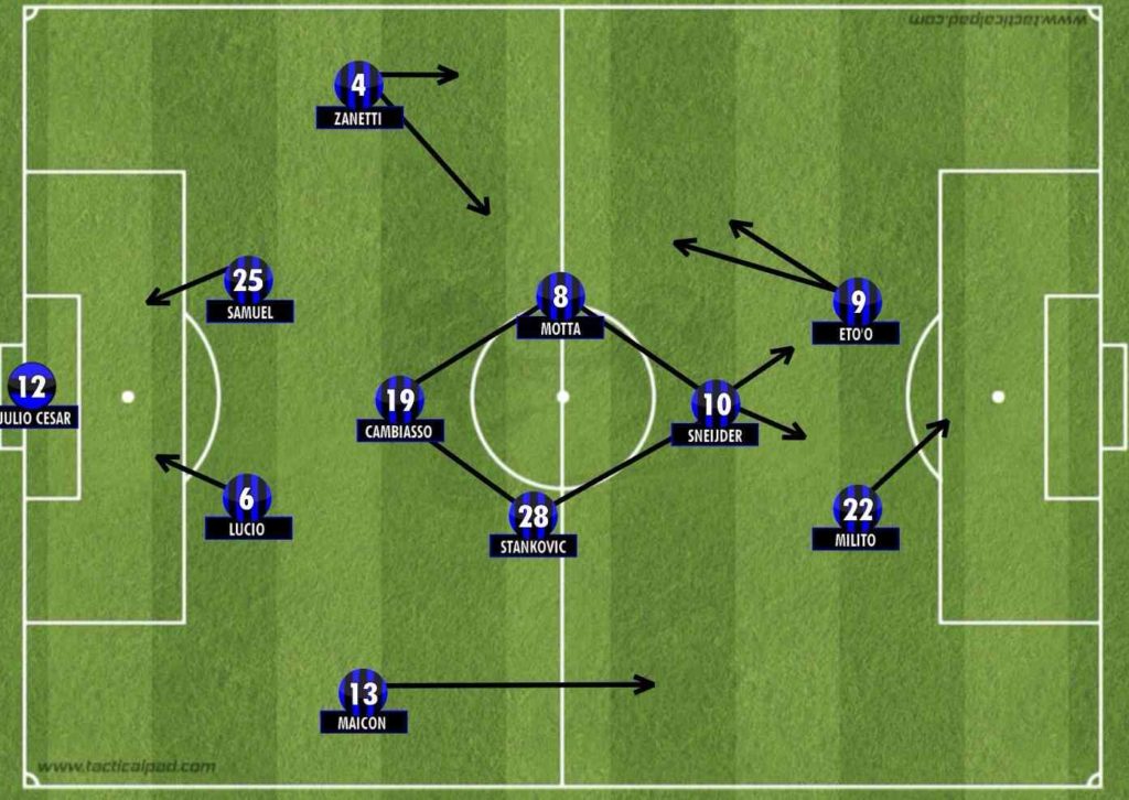 ? سامويل ايتو لعب مع جوزيه بخطة 4-2-3-1 كجناح أيمن يضم للعمق ليساعد ميليتو + الرجوع للتغطية في حالة الانكماش الدفاعي