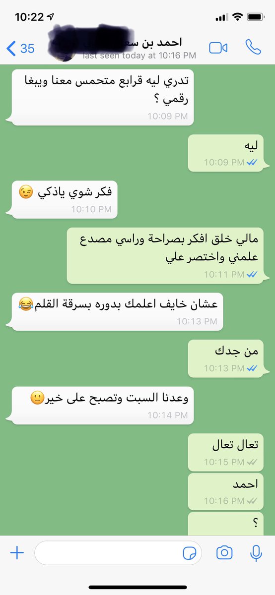 أحمد يحمل شهادة الدكتوراة من جامعة مرموقة في امريكا ، ويعمل في منصب مهم ، ووجهه المتهلل بالفرح والسرور يخبرني عن حياته منذ غادرنا في نجران إلى أن أصبح في الرياض ، عائلته أطفاله ، ومازلت صامتا ، حتى سألني : وانت كيف امورك بشرني عنك ، ابتسمت : علمني ليه سرقت القلم ؟