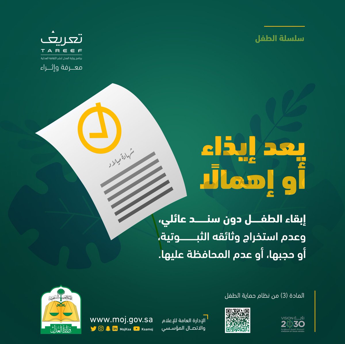 يعد إيذاء أو إهمالاً إبقاء الطفل دون سند عائلي، وعدم استخراج وثائقه الثبوتية، أو حجبها، أو عدم المحافظة عليها.