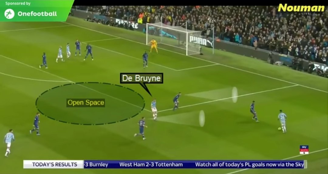 وضحنا سابقاً خطورة دي بروين و التأكد من عدم حصوله على أي مساحة او حرية في هذه المنطقة و هي المنطقة التي عوقب تشيلسي منها
