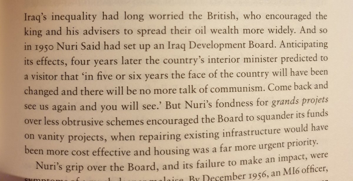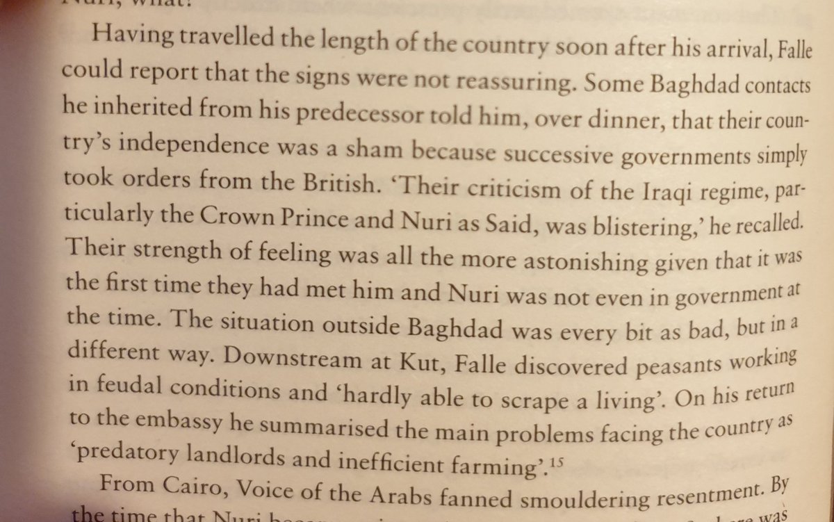 "الشعب فقير جدا و غالبية غير متعلمة و وفيات المواليد عالية. العراق دولة نفطية لكن فقط عوائل ارستقراطية من ملاك الاراضي الاقطاع مستحوذة على الثروة"