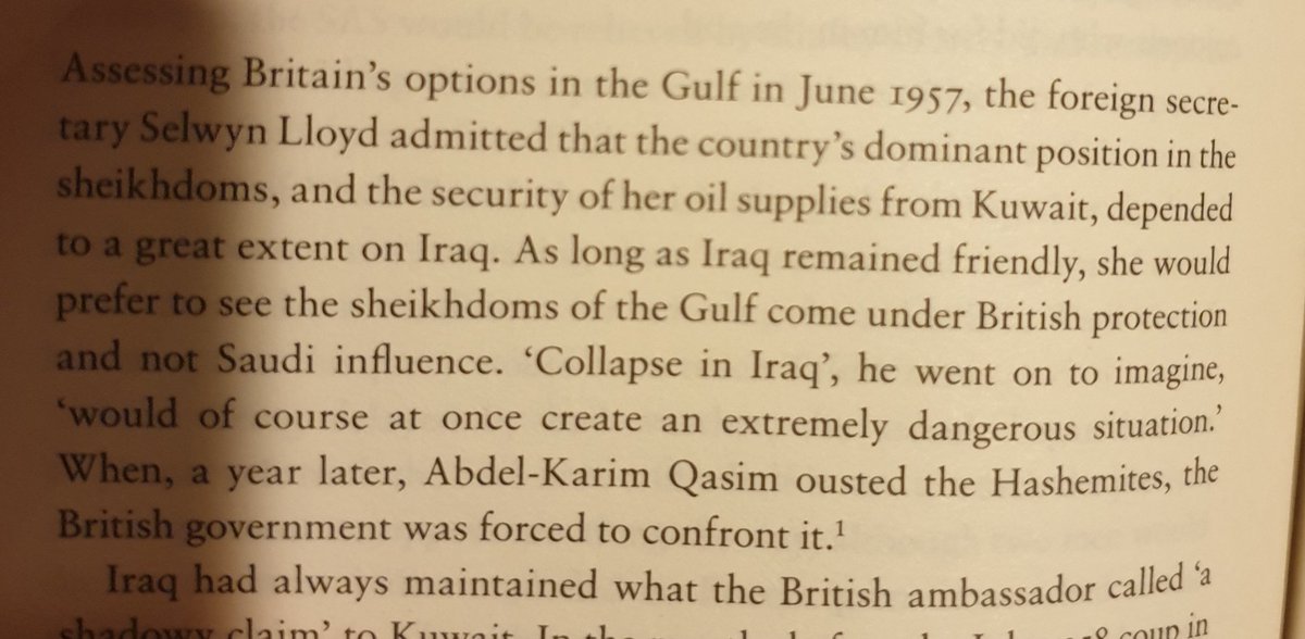 في يونيو ١٩٥٧ قيم وزير الخارجية البريطاني لويد، ان اسقرار الكويت و تصدير نفطها يكون من خلال استقرار العراق نفسه. و ان وجود بريطانيا في الخليج يمنع الكويت و المشيخات الاخرى من الوقوع تحت النفوذ السعودي بالكامل.