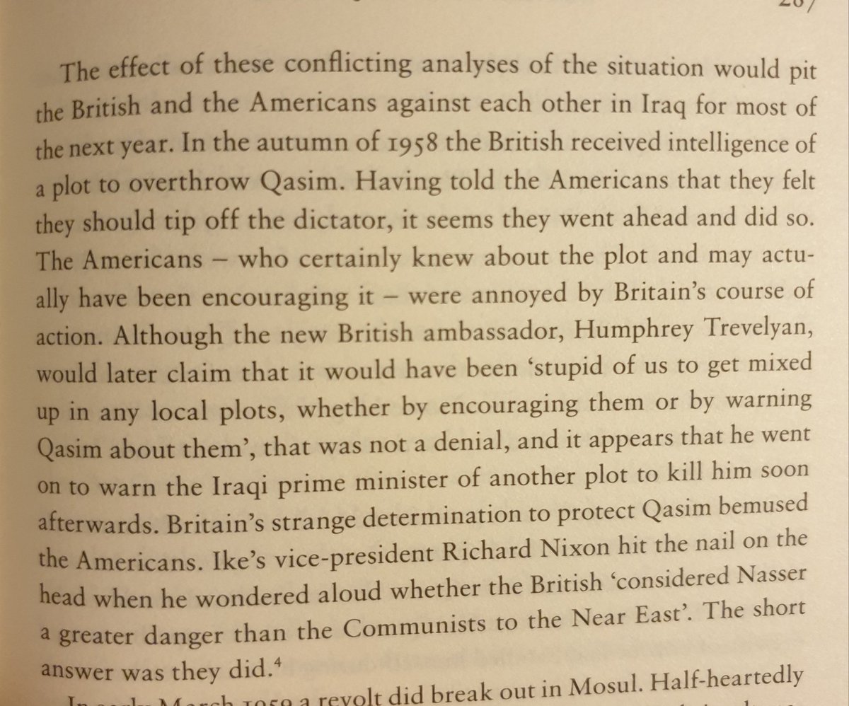 الامريكان كانوا جدا غاضبين من بريطانيا لافشالها انقلاب قاسم. قال وقتها نائب الرئيس الامريكي ريتشارد نيكسون : "البريطانيين يعتبرون عبدالناصر عدو اكبر من الشيوعيين مما يتناقض مع سياساتنا".