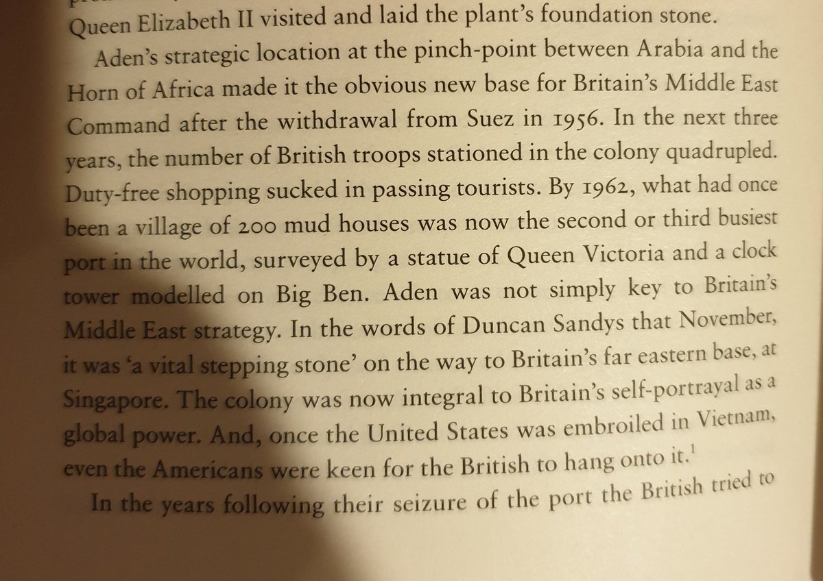 عدن كانت أخر قاعدة بريطانية عسكرية في الشرق الاوسط بعد انسحابها من قناة السويس ١٩٥٦. و حولت بريطانيا عدن لسوق حرة و ثالث اكبر ميناء تجاري عالمي.