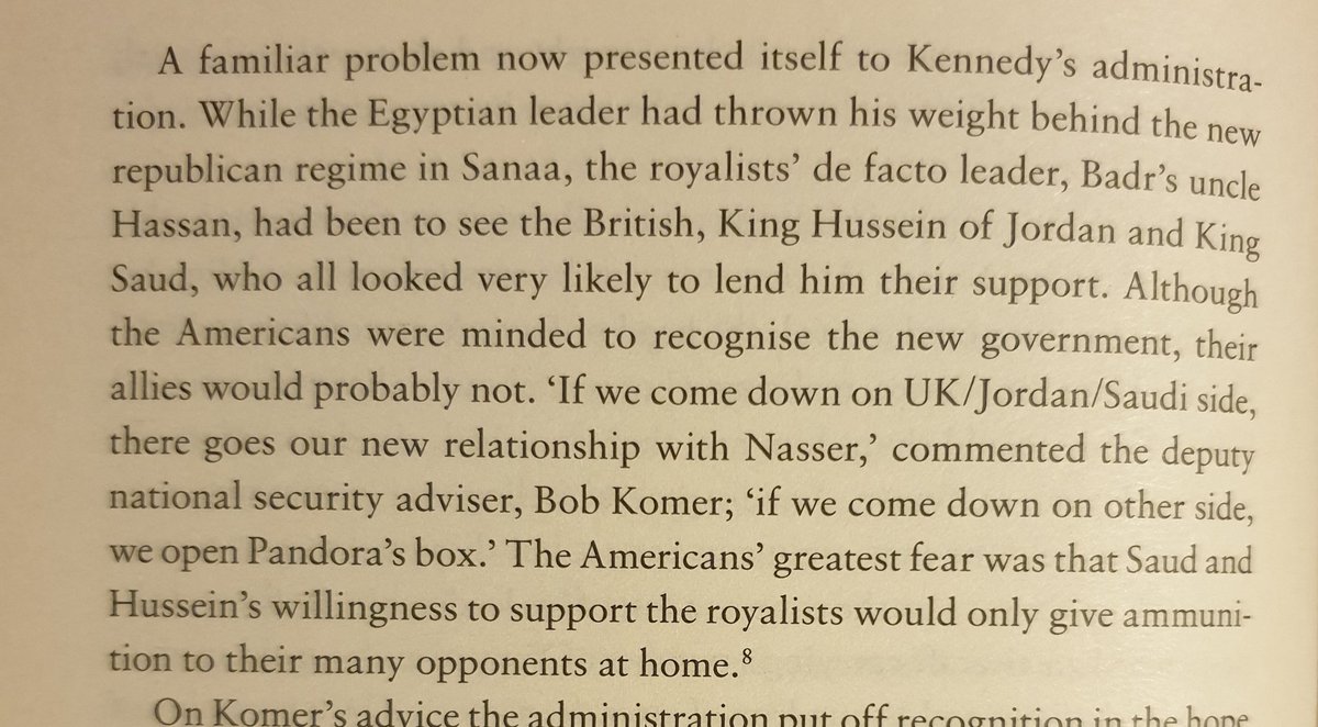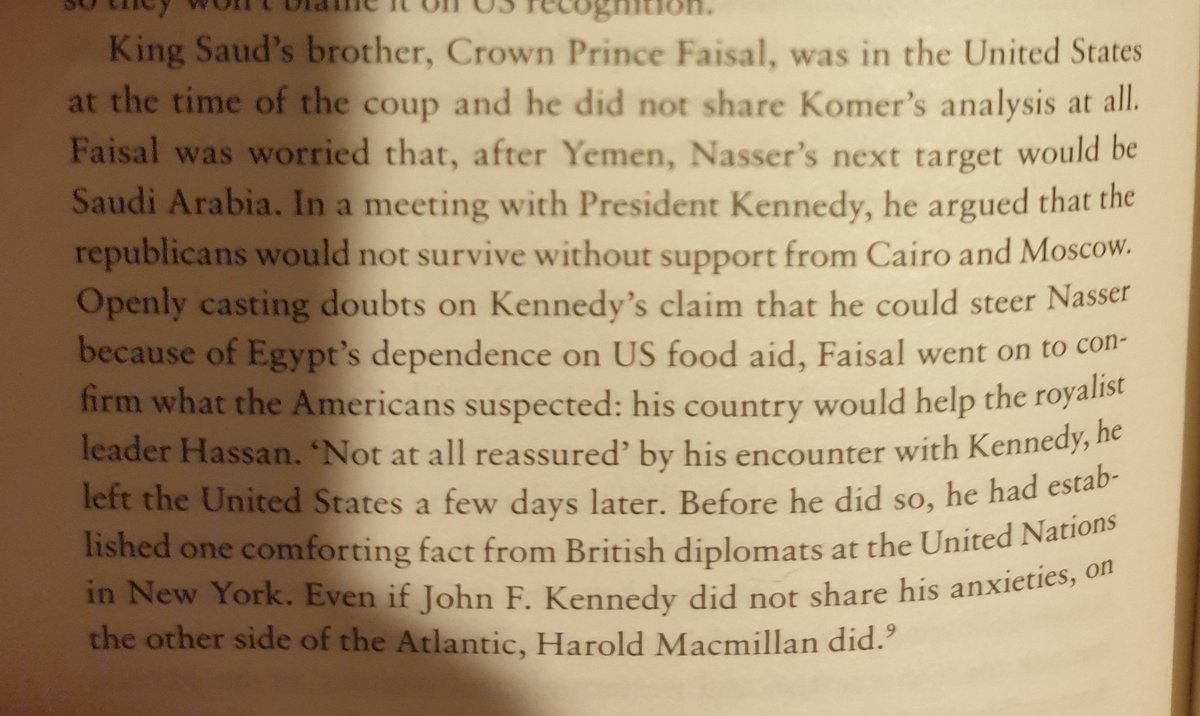 ادارة الرئيس كينيدي كانت تحاول من خلال ولي العهد الامير فيصل بالتهدأ و عدم التورط في اليمن و الاعتراف بالحكم الجمهوري.