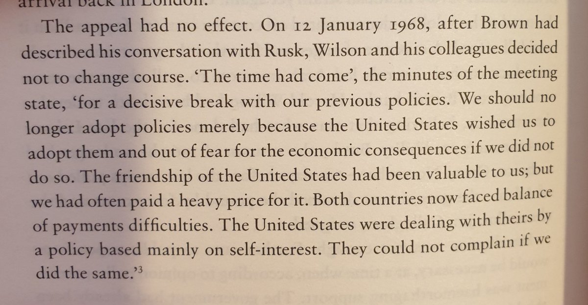 اجتماع الحكومة البريطانية يناير ١٢ ١٩٦٨، اتفق مجلس الوزراء البريطاني بعدم الانصياع للضغوط الامريكية و تقدير وضع بريطانيا و مصالحها اولا. قيل ان امريكا تضع مصالحها فوق الكل لهذا يجب ان تفعل بريطانيا و في نفس الوقت الاحتفاظ بالتحالف مع الولايات المتحدة.