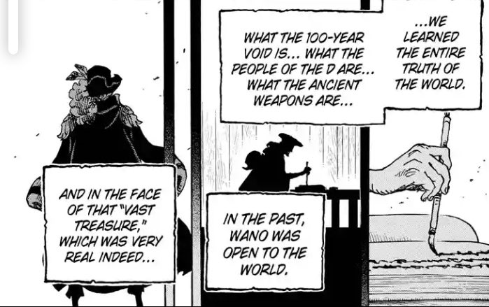 "وفي ذلك اليوم، علمنا الحقيقة الكاملة عن العالم! علمنا عن القرن المفقود، من يحملون اسم الدي، والأسلحة الأسطورية. في الماضي، وانو كانت منفتحة للعالم." مدونة كوزوكي اودن | فصل اكتشاف العالم ?