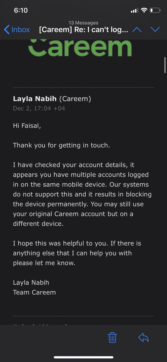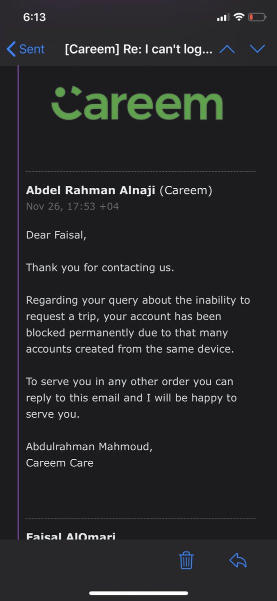 جاني الرد منهم يقول: حسابك مخالف للانظمة بسبب تسجيل عضويات عديدة من نفس الجهاز! طبعا الجهاز جهازي من سنة،والعضوية اللي فيه عضويتي الوحيدة برقم جوالي الوحيد وايميلي الوحيد وبطاقتي الائتمانية. قلت لهم تأكدوا من برنامجكم أو ارفقوا مايثبت ادعاءكم. @careem @CareemCare @SaudiTransport
