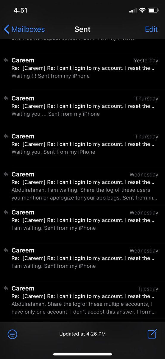 الاشكالية بدأت لما فرمت الجهاز وحبيت انزل التطبيق بهدف استفيد من عرض وزارة الصحة لتطعيم الانفلونزا. حملت التطبيق وحاولت اسجل دخول بحسابي ومارضى يفتح معاي. رفعت شكوى بالموقع وماوصلني رد، بعدها بكم يوم كتبت لهم بتويتر وبدأ مسلسل النسخ واللصق. @careem @careemcare @SaudiTransport
