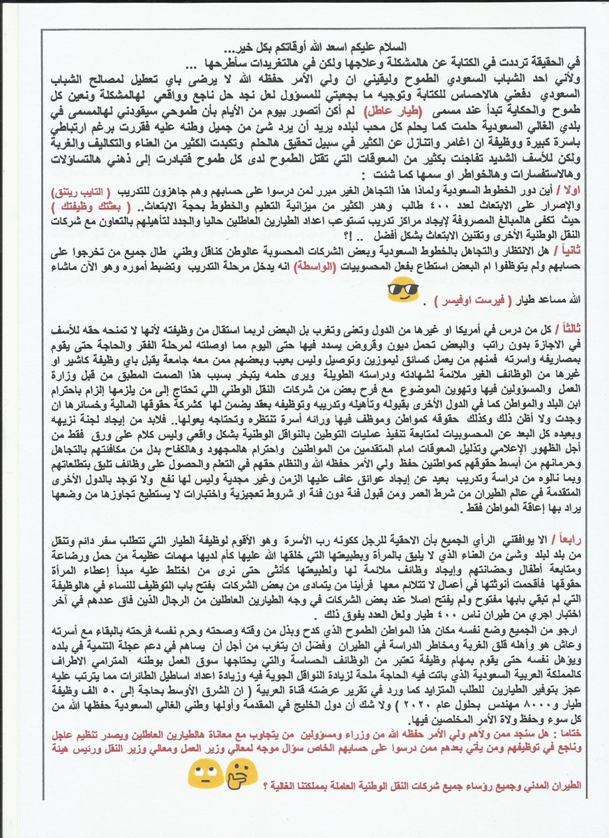 ممن ولاهم ولي الأمر حفظه الله من وزراء ومسؤلين من يتجاوب مع معاناة هالطيارين العاطلين ويصدر تنظيم عاجل وناجع في توظيفهم ومن يأتي بعدهم ممن درسوا على حسابهم الخاص سؤال موجه لمعالي وزير العمل ومعالي وزير النقل ورئيس هيئة الطيران المدني وجميع رؤساء جميع شركات النقل الوطنية؟ ??