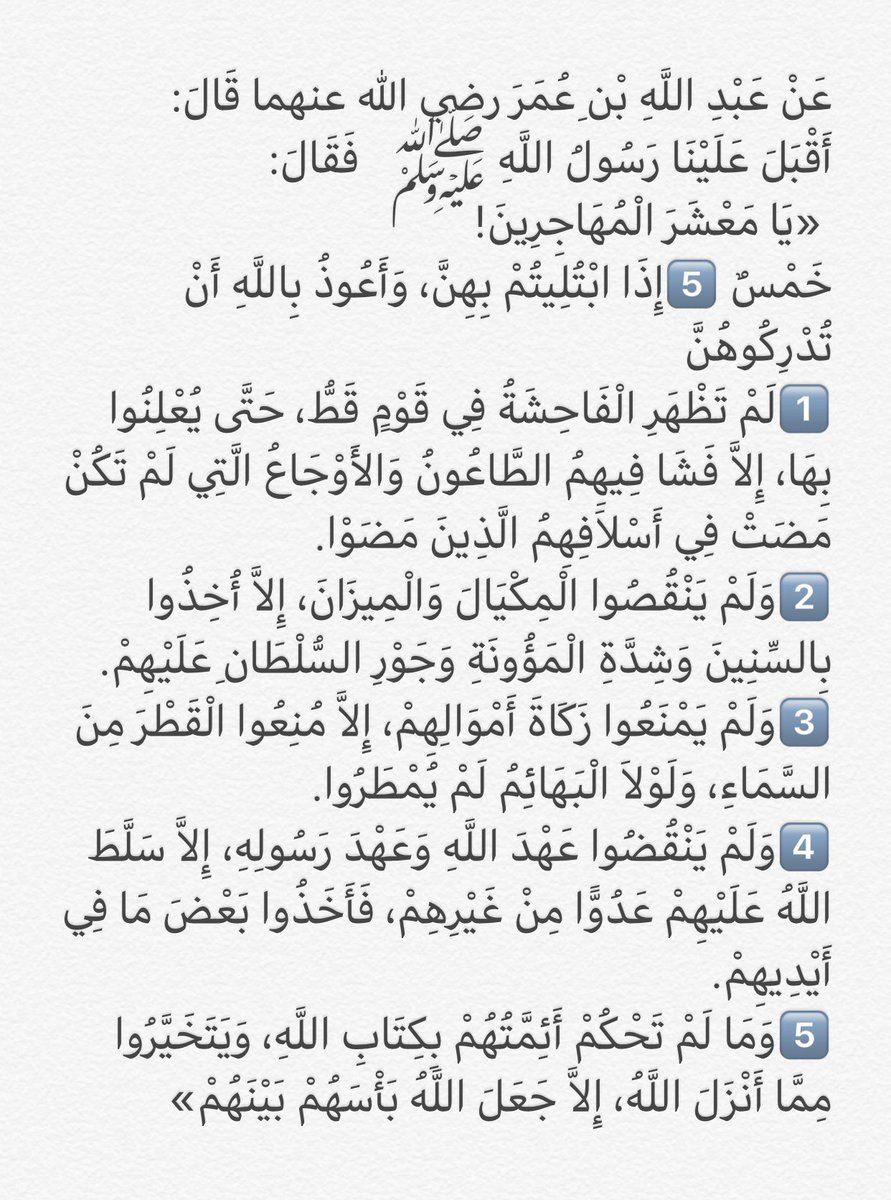 قال ﷺ خَمْسٌ إِذَا ابْتُلِيتُمْ بِهِنَّ، وَأَعُوذُ بِاللَّهِ أَنْ تُدْرِكُوهُنَّ