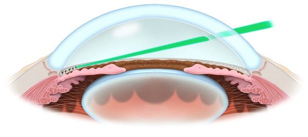 *ليزر وقائي او علاجي للجلوكوما او الماء الأزرق: يتم من خلاله عمل فتحة بالليزر في قزحية العين لمنع انغلاق الزاوية الأمامية المؤدي الى ارتفاع الضغط داخل العين تجرى بواسطة اي طبيب عيون وكذلك ليزر لفتح زاوية العين الأمامية وتجرى بواسطة استشاري الماء الأزرق