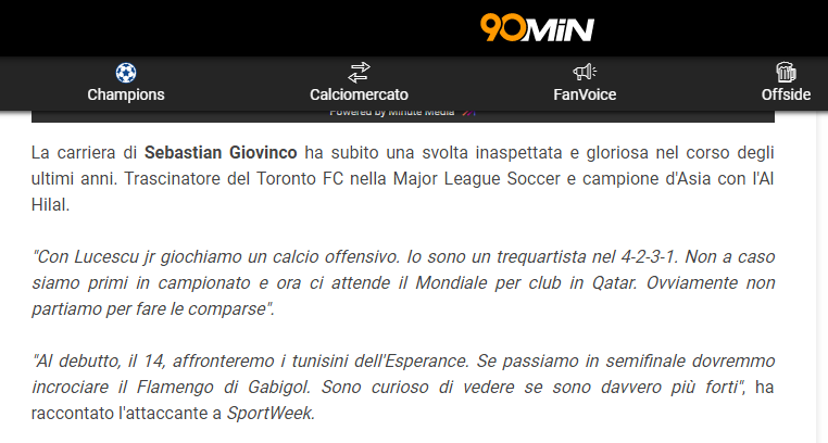 تحدث جيوفينكو لـ"سبورت ويك" عن مركزه في تشكيلة #الهلال:"مع لوسيشكو نلعب كرة قدم هجومية، أنا صانع ألعاب في طريقة لعب 4 ـ 2 ـ 3 ـ 1. ليس من قبيل الصدفة أن نكون في المركز الأول في الدوري والآن نلعب كأس العالم للأندية في قطر. من الواضح أننا لن نقم بأي إضافات قبل البطولة".