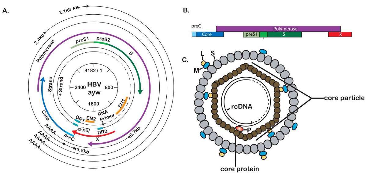 ? HBeAg is the antigenic determinant ويرتبط ارتباطًا وثيقًا بالnucleocapsid كما أنه يعتبر بروتين قابل للذوبان في دم المريض. و يبلغ حجم الحمض النووي للفيروس 3.2 Kb وهو غير مجزأ.