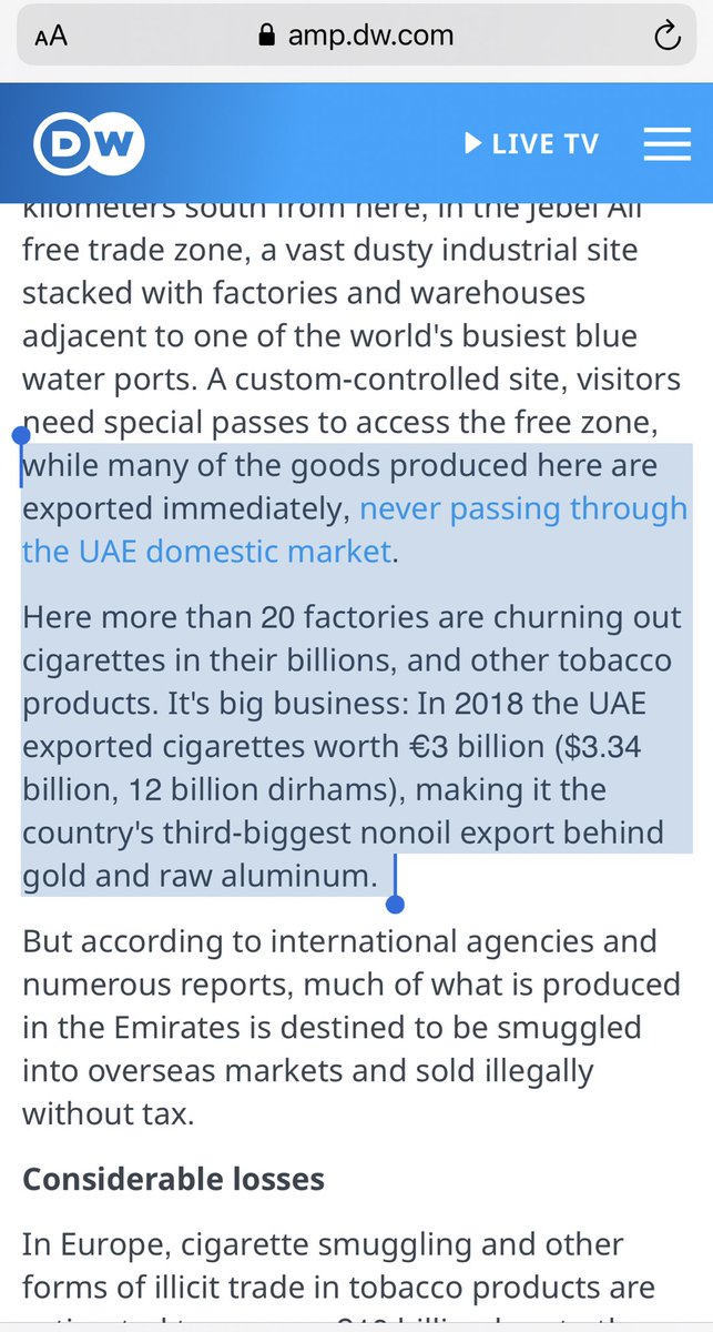 هذا تقرير آخر يقول ان تصدير السجائر يعتبر ثالث أكبر سلعة غير نفطية في الإمارات العربية المتحدة.