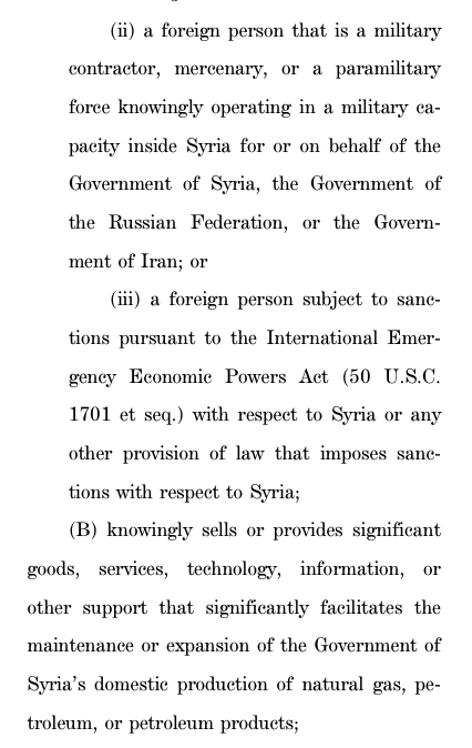 @syrianetf ١- القانون بيفرض عقوبات علي اي شخص، مؤسسة، منظمّة او شركة تتعامل مع نظام بشار الاسد او حكومته. بالسابق كانت العقوبات تمنع التعامل مع اشخاص و مؤسسات محددة في النظام وفي مجالات محددة (المجال العسكري/الكيماوي/الطيران...الخ). اليوم: اي مموّل، اي متعهّد اي تاجر من التعامل يعاقب...