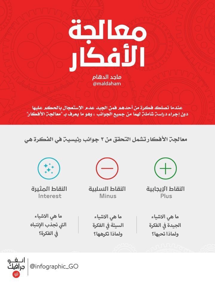 عندما تخطر على بالك فكرة جديدة أو تصلك فكرة من أحدهم فمن الجيد عدم الإستعجال بالحكم عليها ، دون إجراء دراسة شاملة لهما من جميع الجوانب ، وهو ما يعرف بـ معالجة الأفكار أو PMI .