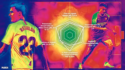 ماركا | بشكل عام، يتمتع مارسيلو وريغيلون بمظهر دفاعي مشابه، على الرغم من أن ريغيلون لديه سلوك أفضل من هذه الناحية، مع ترقب أكبر لقراءة الخصم واعتراض الكرة المتجهه إلى لاعب آخر من المنافس. الجانب الإيجابي المشترك هو ارتفاع عدد عمليات استرداد الكرة.