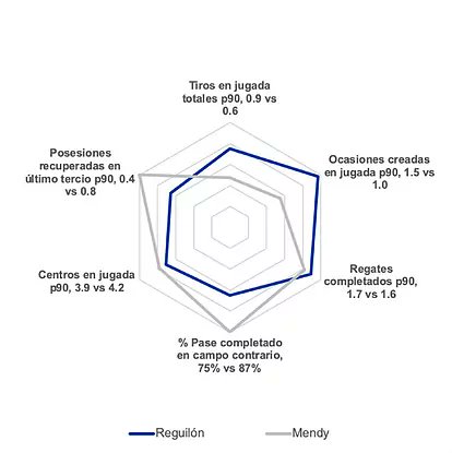 ماركا | لتسهيل قراءة الرسومات، سنقوم بتقسيمها إلى: دفاعي وهجومي. تعكس الأطراف الداخلية والخارجية لمخطط الرادار النسبة المئوية من 5% إلى 95% كما هو موضح. أداء ريغيلون، مارسيلو وميندي يُقارن مع الأظهرة في الدوريات الأوروبية الخمس الكبرى، والأفضل هو الأقرب إلى النهاية العليا.
