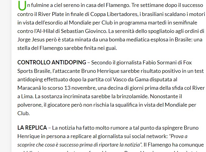 أوضح الصحفي البرازيلي فابيو سورماني أن مهاجم فلامنجو برونو هنريك كانت عينته إيجابية في اختبار المنشطات، لكنه لا يواجه خطر الخروج من كأس العالم للأندية، والغياب عن مباراة #الهلال.